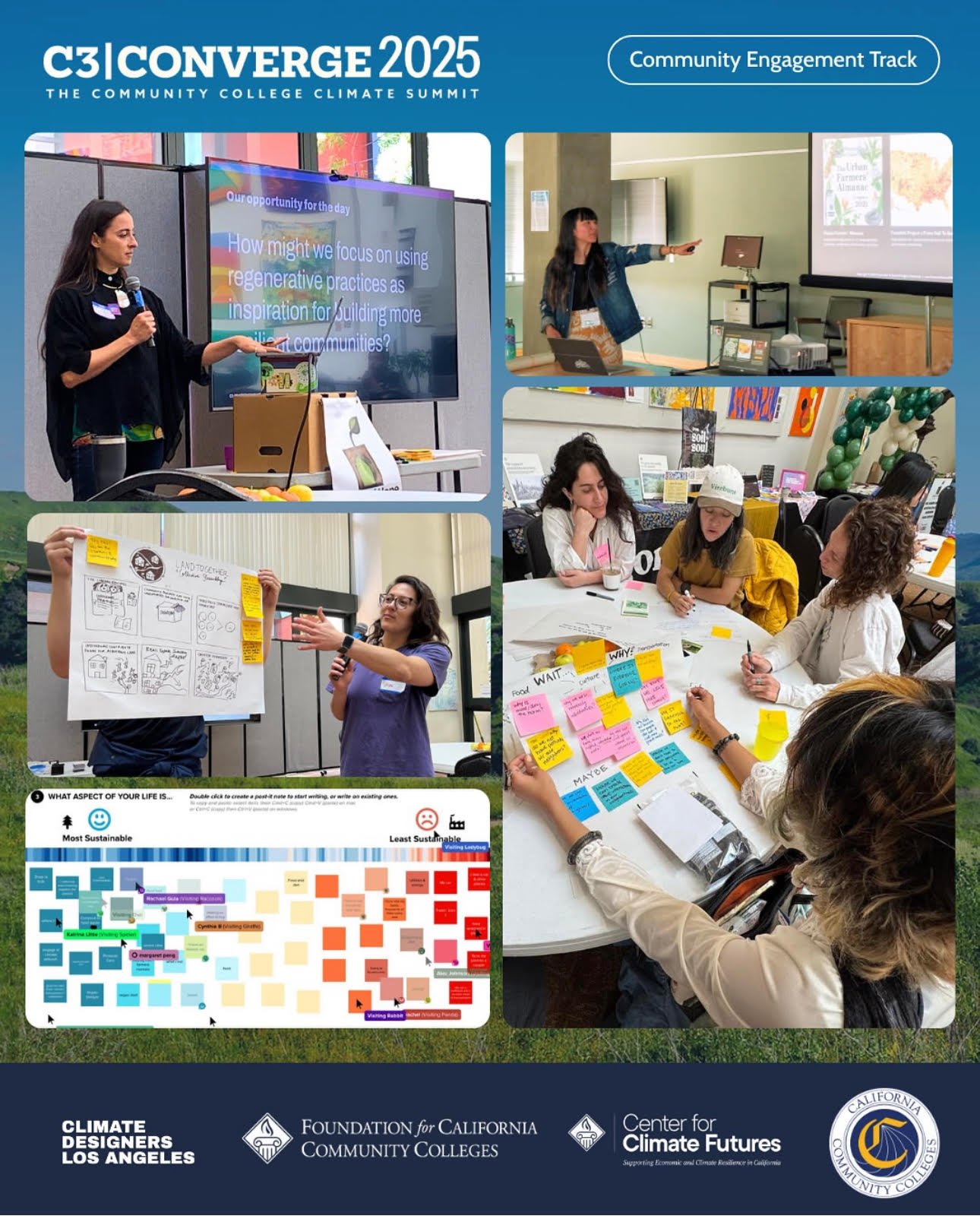 C3CONVERGE 2025 is designed to equip educators, administrators, college partners, and policymakers with the insights and strategies needed to expand climate-related initiatives and strengthen institutional leadership in sustainability. I co-hosted the “Reimagining Your Resilient Campus Community” workshop with along with Climate Designers co-lead Rachel Cellinese, on a hands-on creative session where design meets climate and community action.